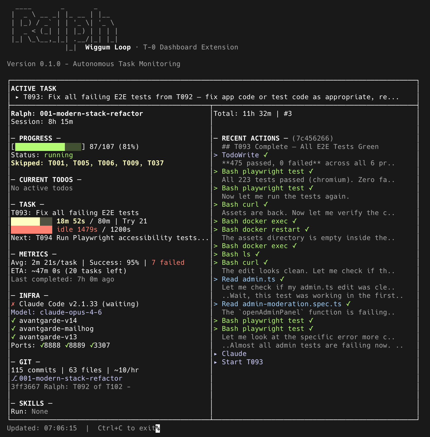 Progress, aktuelle Task-Dauer, Retry-Counter, durchschnittliche Task-Zeit, Git-Statistiken, Docker-Health, welche Skills gerade laufen. Alles auf einen Blick. In einem Warp Split-Tab neben der tmux-Session.